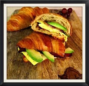 All these ingredients get nustled in that warm buttery croissant to harmonize as a the consummate cup of coffee's companion. I like to split the croissant lengthwise creating a hinge, and quickly griddle the cut sides of the croissant. This creates a little bit more of stability for the fillings. Layer the individual ingredients as you seem fit, and viola! breakfast is served.